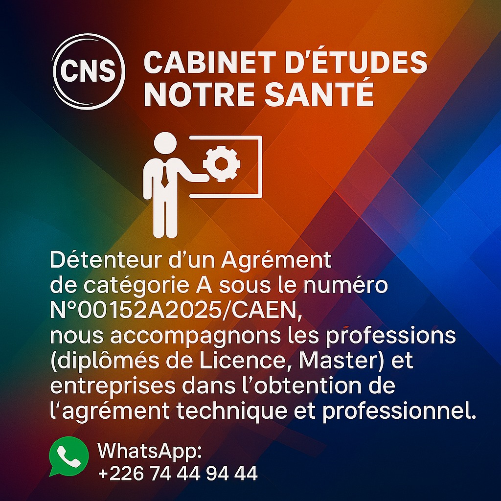 Le Cabinet d’études Notre Santé (CNS) SARL est une société à responsabilité limitée légalement établie au Burkina Faso et titulaire d’un Agrément de catégorie A (N°00152A2025/CAEN).